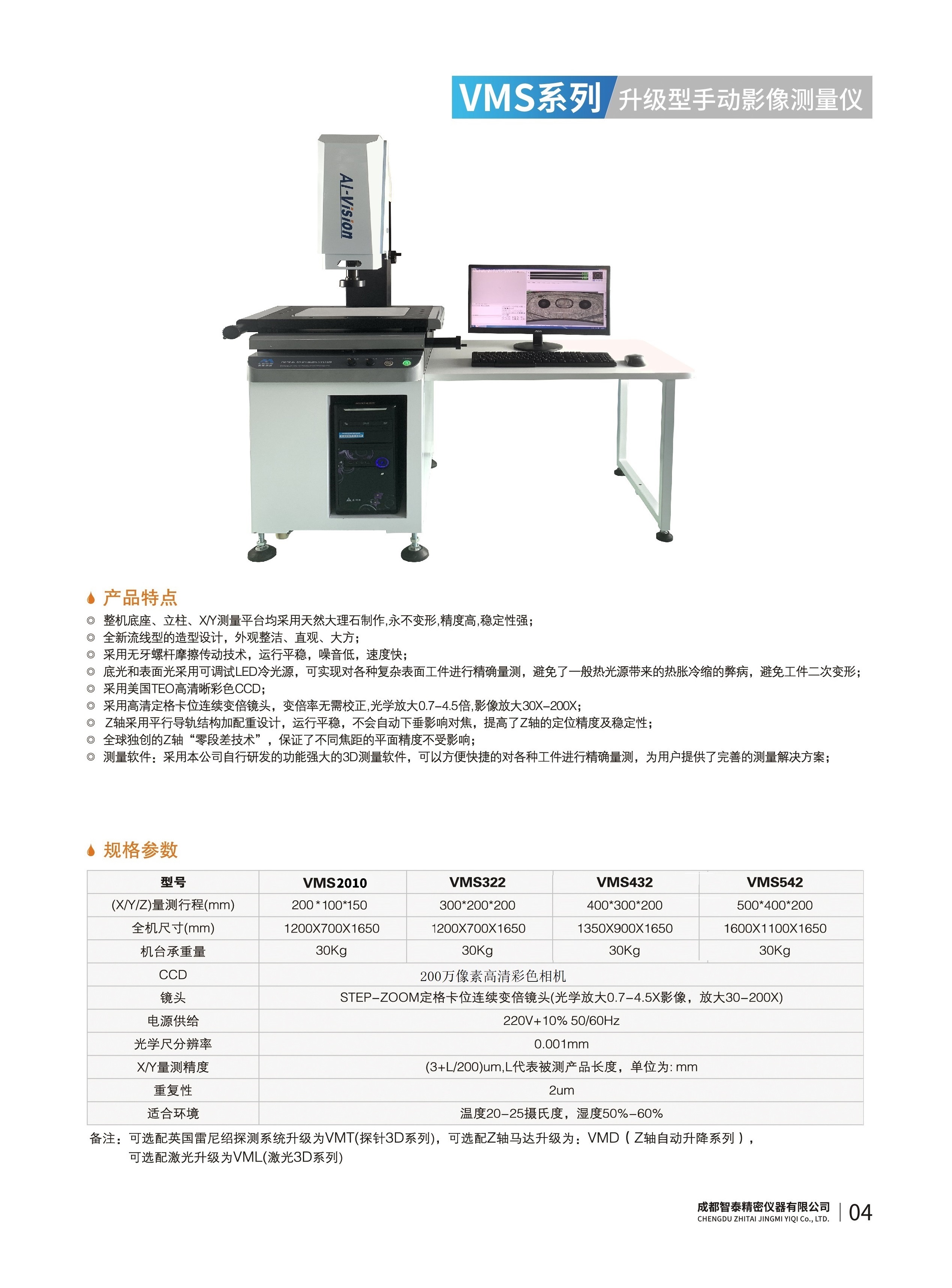 成都智泰精密仪器有限公司专注于精密测量仪器,人工智能,智能制造领域,专业从事智能视觉自动化检测解决方案的贸易型企业。公司成立于2011年,位于天府之国成都,现有行业精英十余人,办公仓储面积200余平米。 公司主要产品为精密光学影像测量仪,精密轮廓形状测量仪,精密机器人定位系统,精密智能视觉尺寸检测仪器,精密表面缺陷智能检测设备,工业工程特种机器人。 公司凭借过硬的技术实力和产品方案,率先进入智能视觉自动化检测领域,推广以精密智能视觉自动化检测为基础的机器人自动化应用,公司不断整合上下游的资源,拥有巨大的全产业链优势??突禾甯哺橇宋夜苤圃煲档亩嗍煊?,包括航空、航天、军工、汽车、新能源、光伏、食品,精密电子、精密机械、模具、PCB、LCD、五金、塑胶、医疗、教育、计量及科研院所等行业。 公司创新的产品能满足生产与制造行业客户的要求,训练有素的工程师能及时提供多种技术服务,如解...